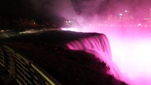 Nachdem wir am Freitagabend an den Niagara Fällen angekommen sind haben wir kurz im Hotel eingecheckt und sind dann direkt zu den Wasserfällen gefahren um sie uns einmal im Dunkeln anzuschauen. Sie sind immer beleuchtet und wechseln in regelmäßigen Abständen auch die Farbe. Und sind wir mal ehrlich, egal was, alles sieht im Dunkeln und mit Beleuchtung nochmal doppelt so schön aus.