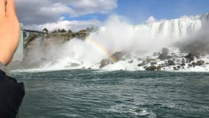 Danach stand „Maid of the Mist“ auf dem Plan, das heißt man kann sich alles von einem Boot aus anschauen und fährt sehr nah an die Fälle heran. Und ja, auch hierbei wird man nass. Nur mit dem Unterschied, dass der Poncho diesmal rot war. Mit dem Wetter hatten wir wirklich Glück, denn durch die Sonne gab es so ca. alle paar Minuten einen neuen Regenbogen irgendwo.