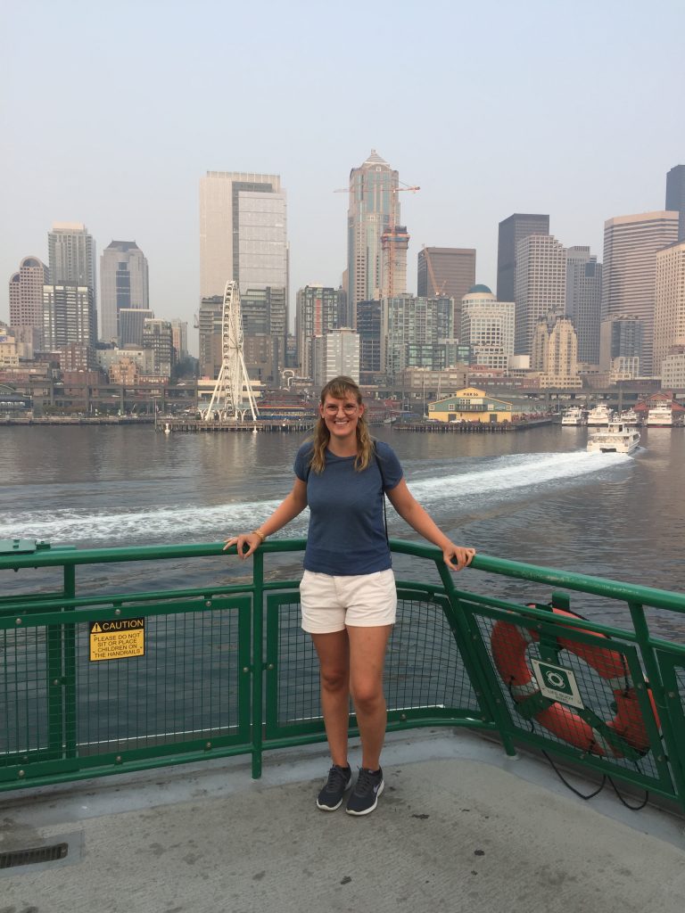 Bainbridge Island und ich auf der Fähre dorthin (verrauchte Luft aufgrund der Feuer in den ersten zwei Wochen hier)