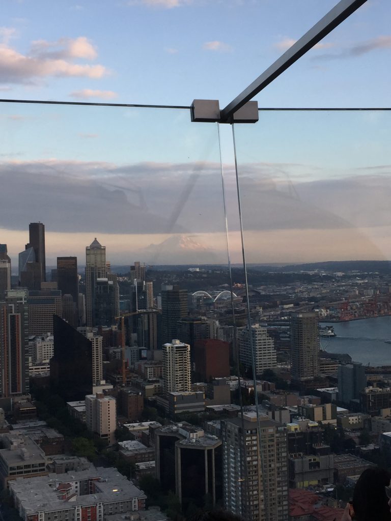 Auf der Space Needle in der Dämmerung (man sieht den Mount Rainier Mittich im Hintergrund)