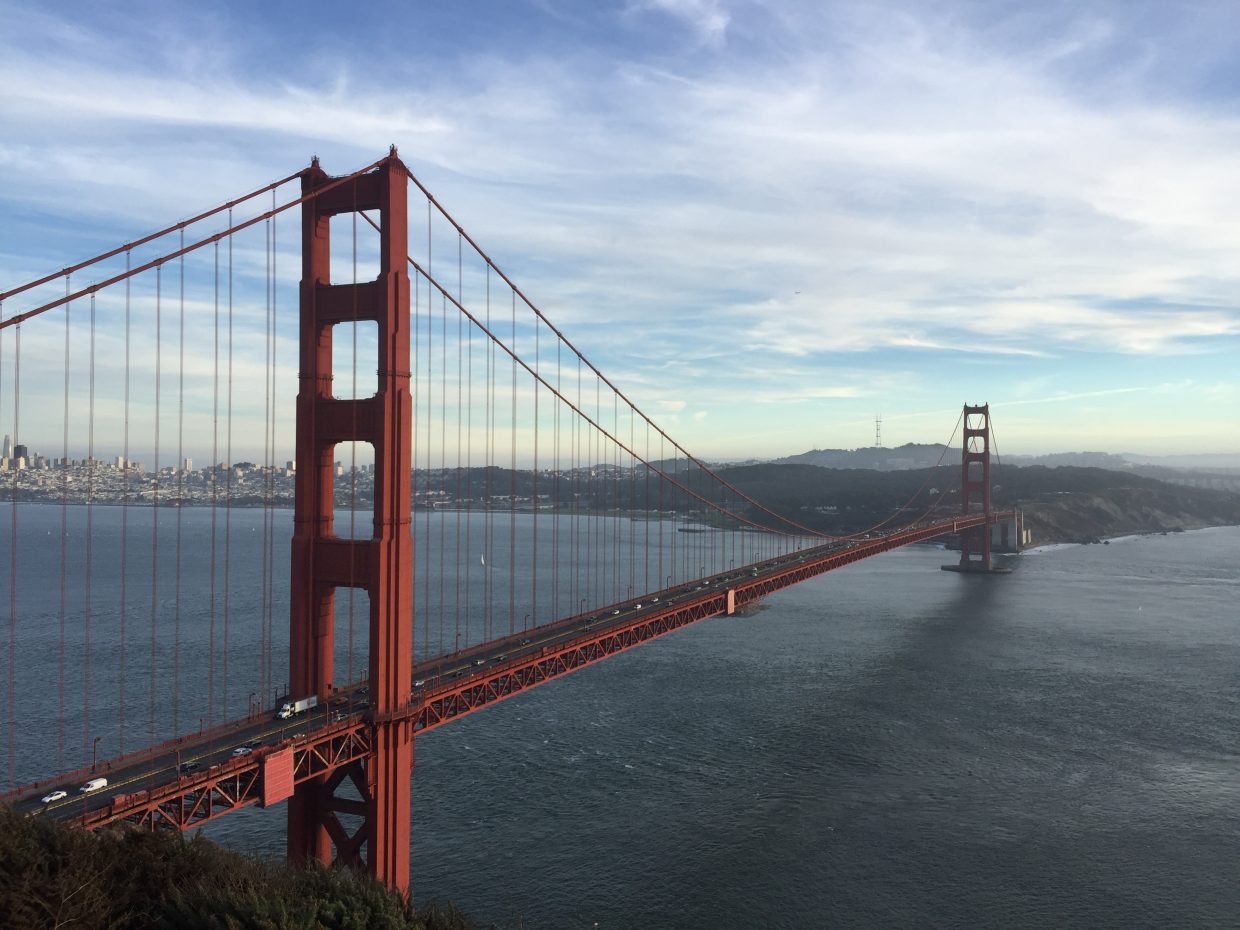 In Kalifornien ist es warm und sonnig, abgesehen von gestern Abend an der Golden Gate Bridge habe ich nicht gefrohren. An dem View Point, zu dem ich gelaufen bin, war der Wind allerdings richtig wild. Ich war froh, irgendwann die verschwommenen Umrisse des Busses in der nebligen Dämmerung ausmachen zu können, um diesem Sandsturm zu entfliehen.