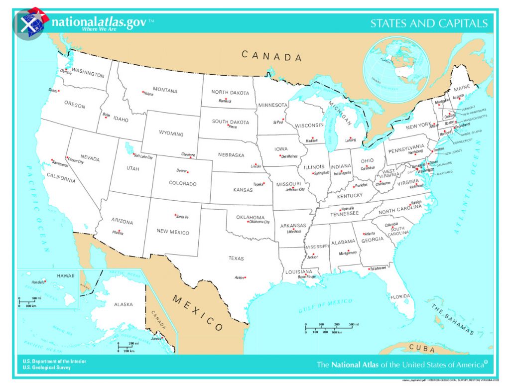 Die 50 Staaten der USA – Seattle ist in Washington, an der Westküste an der Grenze zu Kanada (oben links), die Brände sind in dem großen Staat California, welcher auch an Mexiko grenzt, und der viele Neuschnee fällt gerade in New York, an der Ostküste (auf der anderen Seite oben rechts).