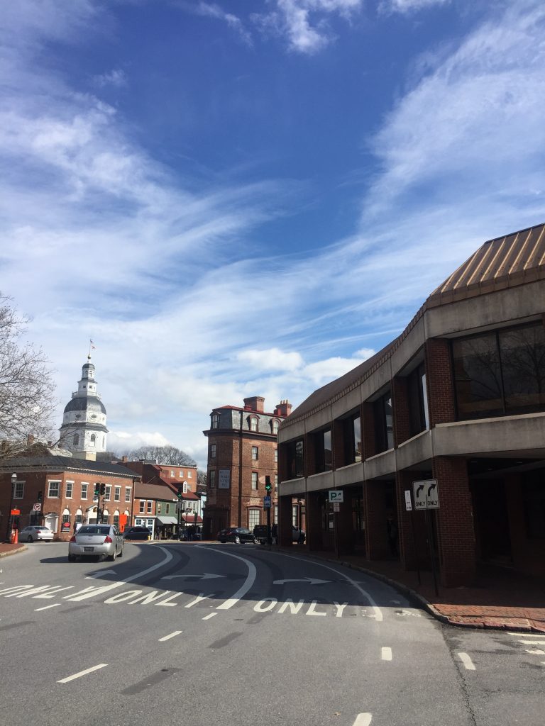 In der Stadt Annapolis gab es diesen Kreisverkehr, an welchem viele wichtige Gebäude vereint waren (das State House ist im Hintergrund).